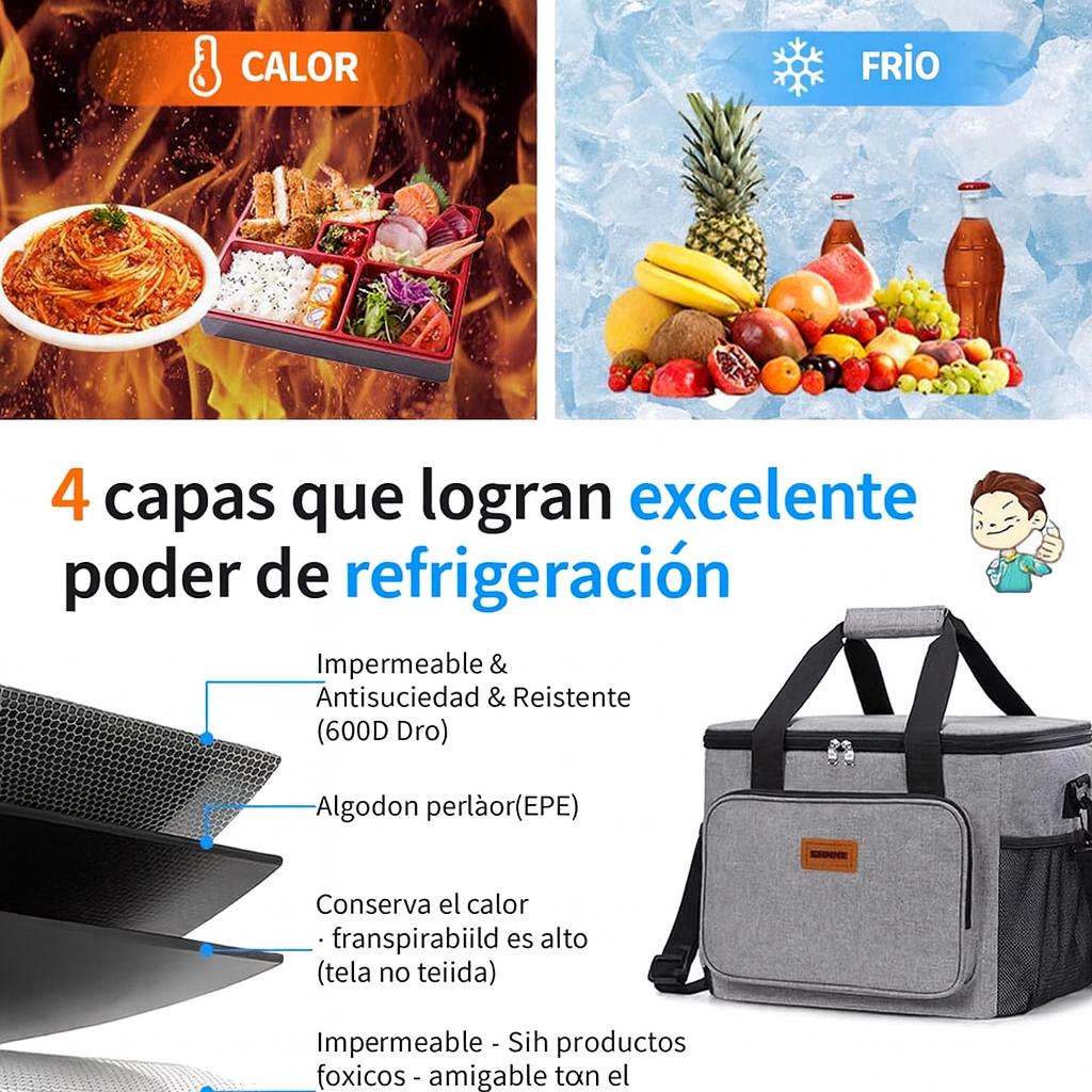 Diseñada para conservar la temperatura de tus comidas, ya sea fría o caliente, por más de 5 horas gracias a su interior aislante de PEVA y su estructura resistente.