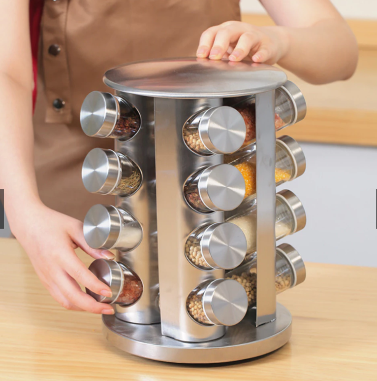 Este porta condimentos giratorio con 16 frascos está hecho de acero inoxidable.